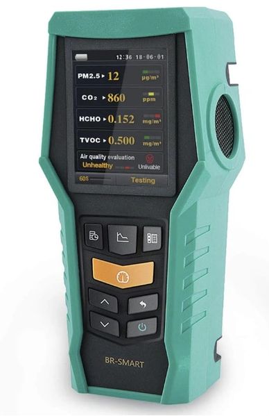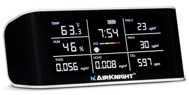 This is a great and fairly low-cost unit to have around the house to monitor your indoor air quality! It can be plugged into an outlet or charged up if you'd like to carry it around to different rooms. It measures temperature, humidity, total VOCs, formaldehyde, carbon dioxide, and particles (PM 2.5 and PM 10).
